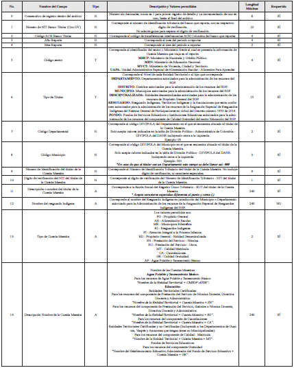 | 14 | Nomenclatura Cuenta Maestra para Pagos Electrónicos | A | Nombre de la Cuenta Maestra: Agua Potable y Saneamiento Básico: Para los recursos de la Participación de Agua Potable y Saneamiento Básico: “Nombre de la Entidad Territorial + Cuenta Maestra Pagadora + AB”. Educación: Entidades Territoriales Certificadas: Para los recursos del componente de Prestación del Servicio Nómina Docente, Directiva Docente y Administrativa: “Nombre de la Entidad Territorial Certificada + Cuenta Maestra Pagadora +PN”. Para los recursos del componente de Prestación del Servicio, distinto a Nómina Docente, Directiva Docente y Administrativa: “Nombre de la Entidad Territorial Certificada + Cuenta Maestra Pagadora + PE”. Para los recursos del componente de Cancelaciones: “Nombre de la Entidad Territorial Certificada + Cuenta Maestra Pagadora + CD”. Entidades Territoriales Certificadas y no Certificadas (Incluyendo a los Departamentos de Guainía, Vaupés y Amazonas que tengan áreas no municipalizadas): Para los recursos del componente de Calidad Matrícula: “Nombre de la Entidad Territorial + Cuenta Maestra Pagadora+ MA”. Fondos de Servicio Educativo: Para los recursos del componente de Calidad Gratuidad: “Nombre del Establecimiento Educativo Administrador del Fondo de Servicio Educativo + Cuenta Maestra Pagadora + CG” Participación de Propósito General, las Asignaciones Especiales y la Asignación para la Atención Integral a la Primera Infancia: Para los recursos de la Participación de Propósito General: “Nombre de la Entidad Territorial + Cuenta Maestra Pagadora + PP”. Para los recursos de la Asignación Especial de Alimentación Escolar: “Nombre de la Entidad Territorial + Cuenta Maestra Pagadora + LP”. Para los recursos de la Asignación Especial de Municipios Ribereños: “Nombre de la Entidad Territorial + Cuenta Maestra Pagadora + PR”. Para los recursos de la Asignación Especial de Resguardos Indígenas: “Nombre de la Entidad Territorial + Nombre del Resguardo Indígena + Cuenta Maestra Pagadora + RP”. Para los recursos de la Asignación Especial para los Resguardos Indígenas que administren los Departamentos con áreas no municipalizadas: “Nombre del Departamento + Nombre del Resguardo Indígena + Nombre del Área no Municipalizada + Cuenta Maestra + RP” | 240 | SÍ |