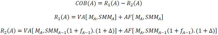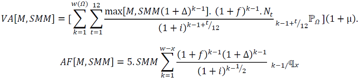 | VA[M, SMM]: | Valor presente actuarial, en pesos, de una renta vitalicia que inicia en M y no puede ser inferior al salario mínimo. El salario mínimo inicial es SMM. |