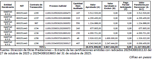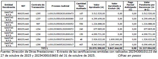 Que mediante la comunicación radicada en el Ministerio de Hacienda y Crédito Público con el número 1-2025-117789 del 13 de noviembre de 2025, el Director General de la ADRES remitió las certificaciones suscritas por el Director de Otras Prestaciones de la ADRES, en las cuales certifica nlo siguiente: “Que SANAITS EPS presentó servicios y tecnologías no financiados con recursos de la UPC al saneamiento definitivo de que trata el artículo 237 de la Ley 1955 de 2019, y una vez adelantado el proceso de auditoría en los términos del Decreto número 521 de 2020, modificado por el Decreto número 507 de 2022 y la Resolución número 618 de 2020 le fueron aprobados recursos; por ende, corresponde su reconocimiento y pago, conforme se relaciona a continuación: