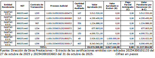 Los valores aprobados coinciden con lo estipulado en el contrato de transacción suscrito con la mencionada EPS, conforme a lo establecido en el Decreto número 521 de 2020, modificado por el Decreto número 1810 de 2020 y el Decreto número 507 de 2022