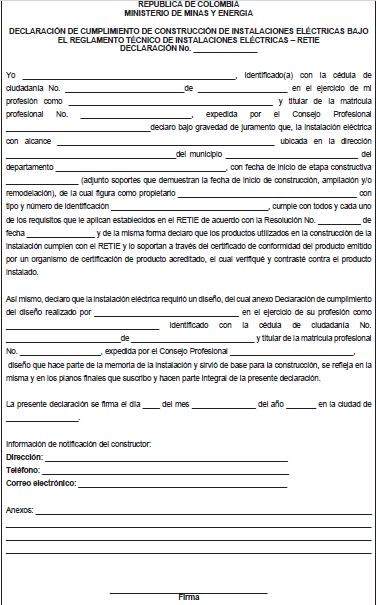 El Ministerio de Minas y Energía de Colombia es el órgano competente para la elaboración, revisión, actualización, interpretación y modificación del RETIE. La interpretación la podrá realizar mediante oficio o por solicitud de terceros.
