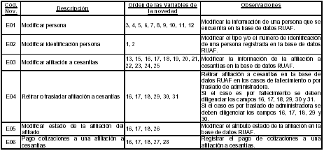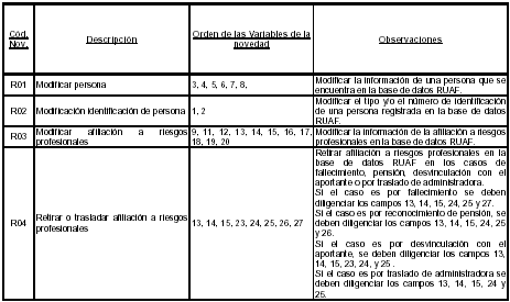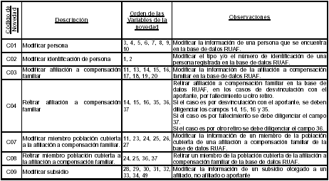 Estos son los códigos de las novedades de actualización que deberán reportar periódicamente las cajas de compensación familiar de acuerdo con las modificaciones realizadas a la información de los afiliados, los miembros de la población cubierta, las afiliaciones y los aportantes. Se deben diligenciar los campos en el orden establecido en esta tabla, estas novedades sólo aplican para afiliados existentes en el Registro Unico de Afiliados a la Protección Social, RUAF.