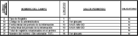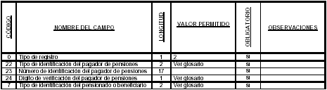 | Código del campo | Nombre del campo | Long itud | Valor permitido | Obligatorio |