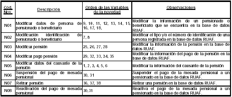 | Código de Novedad | Descripción | Orden de las Variables de la novedad | Observaciones |