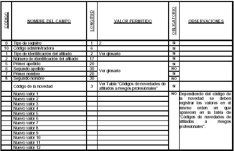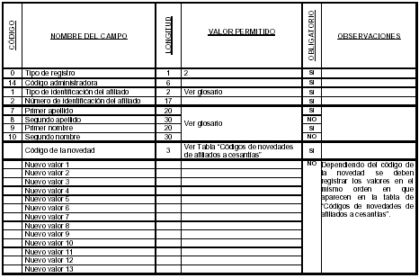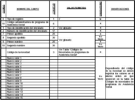 El número máximo de valores que va en cada novedad depende de los campos que contiene cada una de estas. Cuando en una novedad hayan campos que no van a ser modificados o reportados, este campo no llevará ningún valor, es decir, debe ir vacío y reportarse en el archivo como (,,).