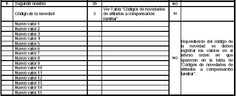 De acuerdo con cada novedad, se deben diligenciar los campos obligatorios y aquellos que estén sujetos a modificaciones, teniendo en cuenta el orden indicado en la tabla “CODIGOS DE NOVEDADES DE AFILIADOS A COMPENSACION FAMILIAR”.