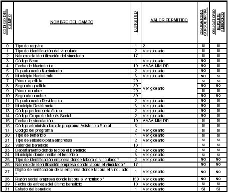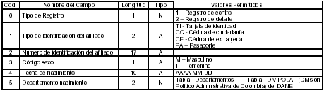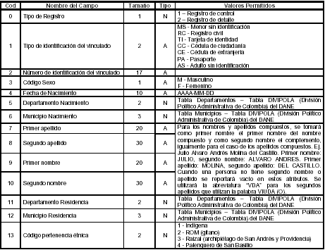 El archivo maestro de vinculados a programas de asistencia social está compuesto por un único registro de control (Registro Tipo 1) utilizado para verificar la información contenida en el archivo y un conjunto de registros de detalle (Registro Tipo 2) que contienen la información de los afiliados solicitados en la etapa del cargue inicial así como para el reporte periódico de creación de nuevos vinculados a programas de asistencia social.