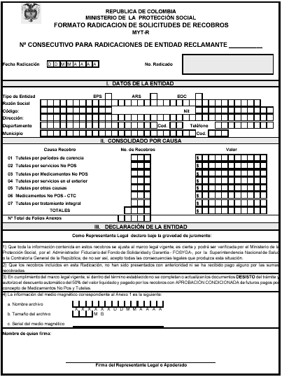 | 66 | NoRadicaciónrecobroanterior(FormatoMYT-R) | Número de consecutivo de radicación del formato MYT-R | Corresponde al número de radicación asignado por el Administrador Fiduciario de los recursos del FOSYGA al consolidado de solicitudes de recobro (formato MYTR) | Numérico | 8 |