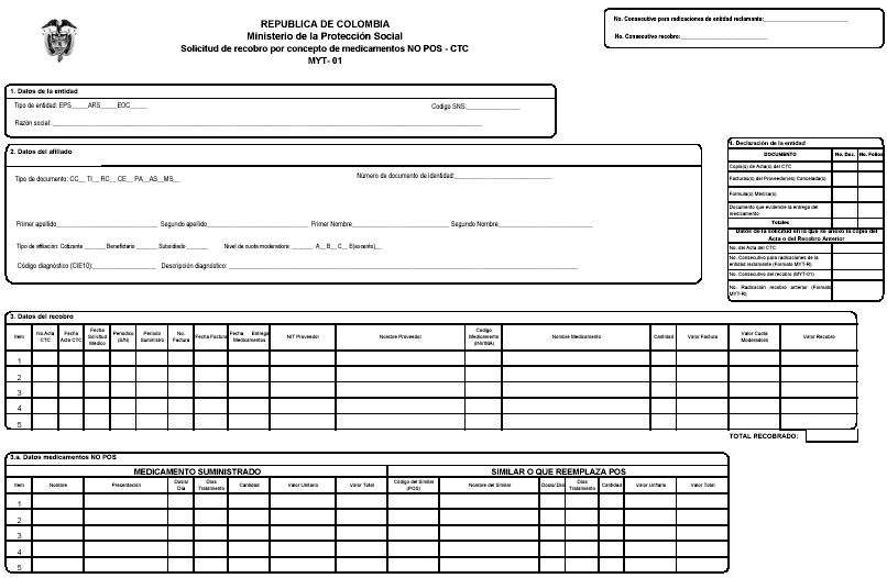 a) Formato de “SOLICITUD DE RECOBRO POR CONCEPTO DE MEDICAMENTOS NO POS-CTC”, numerada consecutivamente por cada paciente, el cual se adopta en la presente resolución y que deberá diligenciarse en su totalidad;