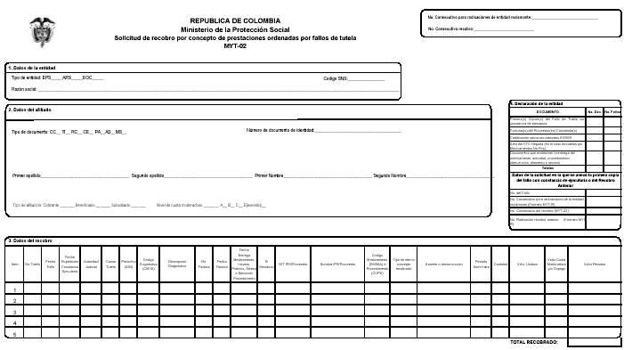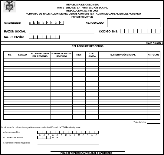 | 65 | NoConsecutivodelrecobro(FormatoMYT-02) | Número de consecutivo de radicación del formato MYT-02 | Corresponde al número interno asignado al recobro anterior (formato MYT-02) | Numérico | 20 |