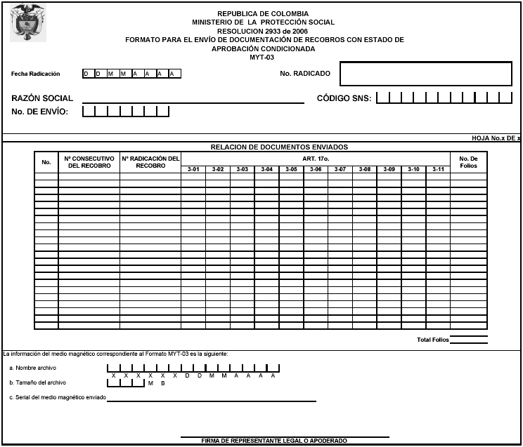 | 1 | FecRadica | Fecha de radicación del formato MYT 03 | Fecha de radicación del formato MYT-03, formato DD/MM/AAAA | Texto | 10 |