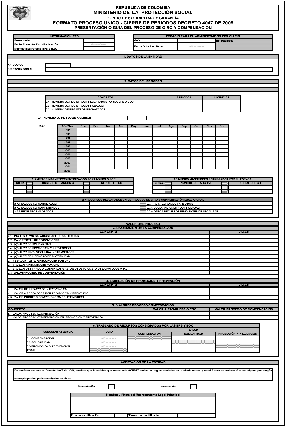 En virtud de lo establecido en el artículo 2o del Decreto 4047 de 2006, se define el siguiente formato como el Formato de Presentación y Guía del proceso único de cierre de periodos decreto 4047 de 2006