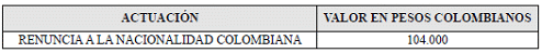 a) En el territorio nacional: La tarifa por concepto del trámite de renuncia a la nacionalidad colombiana en el territorio nacional, es: