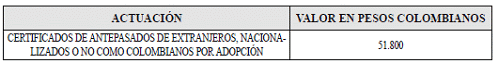 a) En el territorio nacional: la tarifa para el trámite del certificado de antepasados de extranjeros nacionalizados o no, como colombianos por adopción, será: