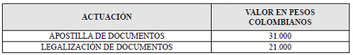 ARTÍCULO 4o. TARIFA PARA LA EXPEDICIÓN DE APOSTILLA O LEGALIZACIONES. <Resolución derogada por el artículo de la Resolución 9593 de 2022> Las tarifas por concepto de apostilla o legalización de documentos que van a producir sus efectos en el exterior, son: