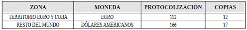 ARTÍCULO 5o. TARIFAS PARA LA PROTOCOLIZACIÓN DE ESCRITURAS PÚBLICAS Y COPIAS DE ESCRITURAS PÚBLICAS EN EL EXTERIOR. <Resolución derogada por el artículo de la Resolución 9593 de 2022> Las tarifas para la protocolización de escrituras públicas y copias de escrituras públicas en el exterior son: