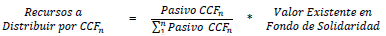 5.2 Particiáción del pasivo de salud, asociado al programa de salud del Régimen Sibsidiado de cada caja de compensación familiar, frente al pasivo total de los demás programas de salud del Régimen Subsidiado de la totalidad de las caja, respecto de las que es procedente el giro de los recursos del esquema de solidaridad para el respectivo corte. Con fundamento en este criterio, la distribución de la totalidad de recursos del esquema de solidaridad se efectuará para cada fecha de corte y aprobación de giro, aplicando la siguiente fórmula:
