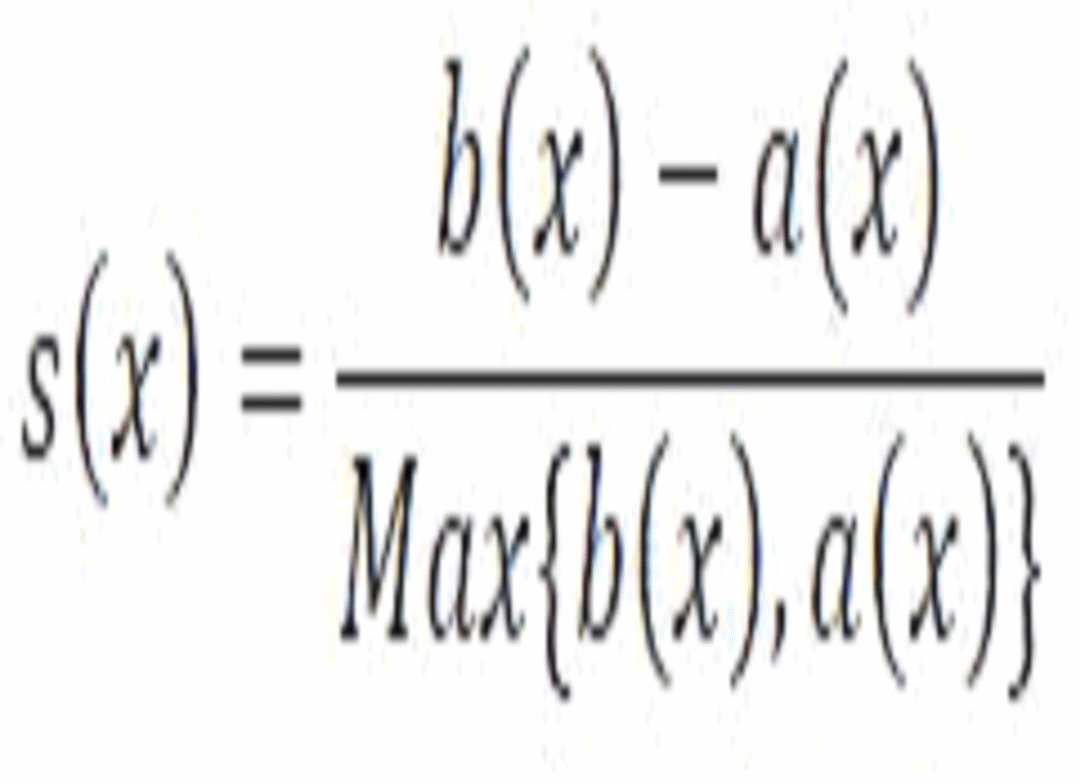 Donde a(x) corresponde a la distancia promedio de x de todos los demás puntos en el mismo clúster y b(x) corresponde a la distancia promedio de x de todos los demás puntos en el conglomerado más cercano.