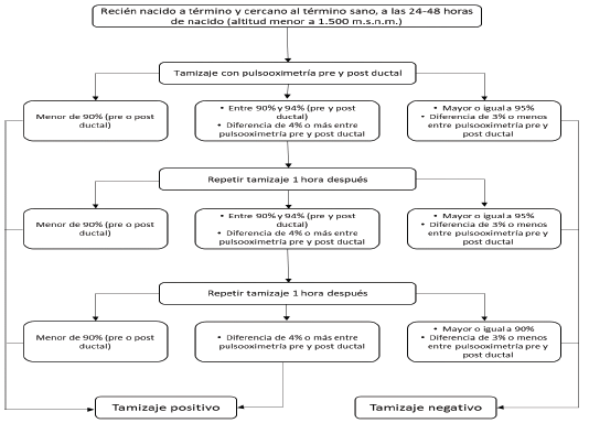 El resultado del tamizaje será positivo cuando: 1) El niño o la niña presente una saturación menor a 90% en cualquier momento del tamizaje y a cualquier altitud, y 2) Cuando presente una diferencia de igual o mayor a 4% entre la pulsooximetría pre y posductal (independiente de cuál sea la mayor) en la medición repetida y a cualquier altitud.