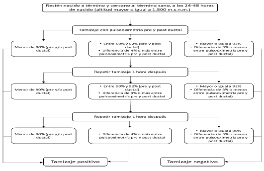 Adicionalmente, debe tenerse en cuenta que el Programa de Tamizaje Neonatal de Colombia frente a la línea de cardiopatía congénita compleja, incluye elementos adicionales de valoración del recién nacido complementarios a la toma de la pulsooximetría, lo que representa una medida complementaria para detectar niños con posible cardiopatía congénita que hayan sido posibles falsos negativos en el tamizaje. De esta forma, a partir del protocolo implementado por la Academia Americana de Pediatría, el Colegio Americano del Corazón y la Asociación Americana del Corazón para el tamizaje de cardiopatía congénita compleja, en el contexto del Programa de Tamizaje Neonatal de Colombia, se considera ajustar los puntos de corte y adaptar el protocolo de tamizaje según la altitud y previendo también los distintos resultados que pueden presentarse como consecuencia de la progresiva adherencia a la indicación de estancia hospitalaria de mínimo 24 horas para los recién nacidos sanos, a término.