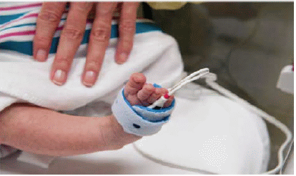 Figura 6. Modelo de realización de tamizaje neonatal de cardiopatía congénita con pulsooxímetro con sensor de cinta adhesiva.