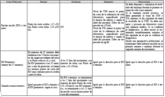 A un programa de tamizaje universal le corresponde valorar la tecnología de tamizaje, definir lo que se considera un resultado positivo, manejo de los casos positivos (es decir probables), definir la tecnología diagnóstica o confirmatoria, definir los casos en los que se hace necesario repetir la prueba y, para lo que corresponde a patologías endocrino metabólicas, definir los niveles del metabolito en el que se considera debe iniciarse tratamiento en tanto se aclara el diagnóstico, dado el riesgo de deterioro del recién nacido, entre otras.
