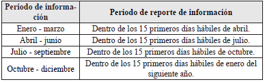 | 31 de diciembre del año de reporte | 1o de octubre a 31 de diciembre | Desde el día 1 del mes siguiente del periodo de corte. | El décimo quinto (15) día hábil del mes siguiente del periodo de corte. |