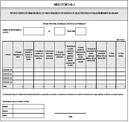 - El Anexo Técnico número 2, suscrito por el Representante Legal de la entidad territorial (Gobernador o Alcalde) y/o el Director de la entidad descentralizada según corresponda, en formato pdf y excel, a la Dirección de Financiamiento Sectorial del Ministerio de Salud y Protección Social.
