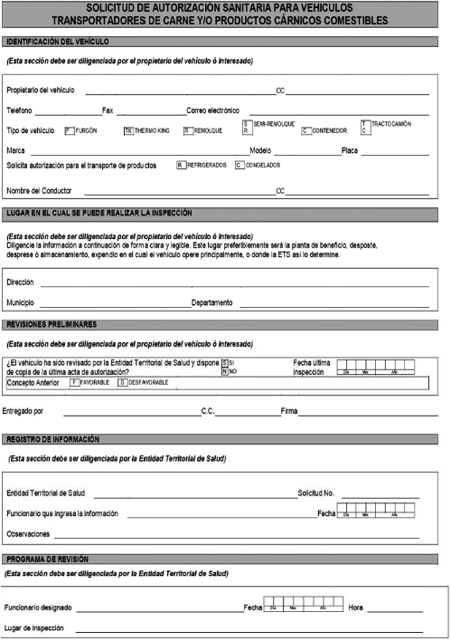 FORMULARIO DE SOLICITUD DE AUTORIZACIÓN SANITARIA PARA VEHÍCULOS TRANSPORTADORES DE CARNE Y/O PRODUCTOS CÁRNICOS COMESTIBLES.