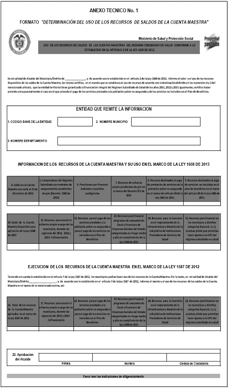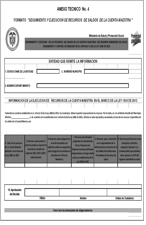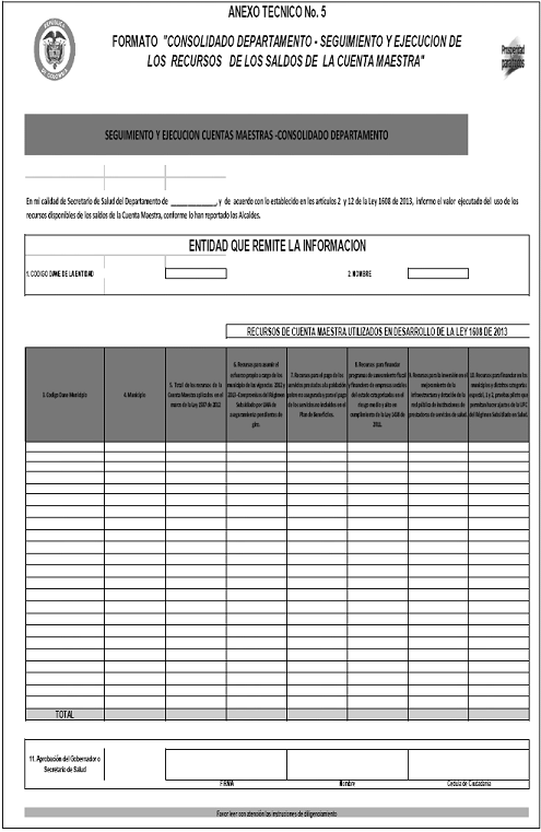 Para el seguimiento y control del uso de los recursos a que hace referencia el artículo 2o de la Ley 1608 de 2013, las entidades territoriales que dispongan de saldos en la Cuenta Maestra deberán diligenciar y enviar en forma obligatoria este formato al departamento, dentro de los diez (10) días hábiles siguientes a la expedición de la presente resolución. Los distritos remitirán este formato directamente al Ministerio.