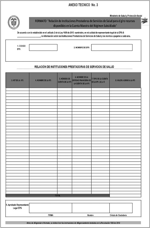 Anexo No. 3. Formato- “Relación de Instituciones Prestadoras de Servicios de Salud para el giro de recursos disponibles en la Cuenta Maestra del Régimen Subsidiado”. Mediante este formato las EPS-S, reportarán a las Entidades Territoriales, la relación de las Instituciones Prestadoras de Servicios de Salud y el valor a cancelar a cada una de estas, acorde con lo dispuesto en el numeral 1 del artículo 2o de la Ley 1608 de 2013, el cual debe ser diligenciado por la EPS-S.