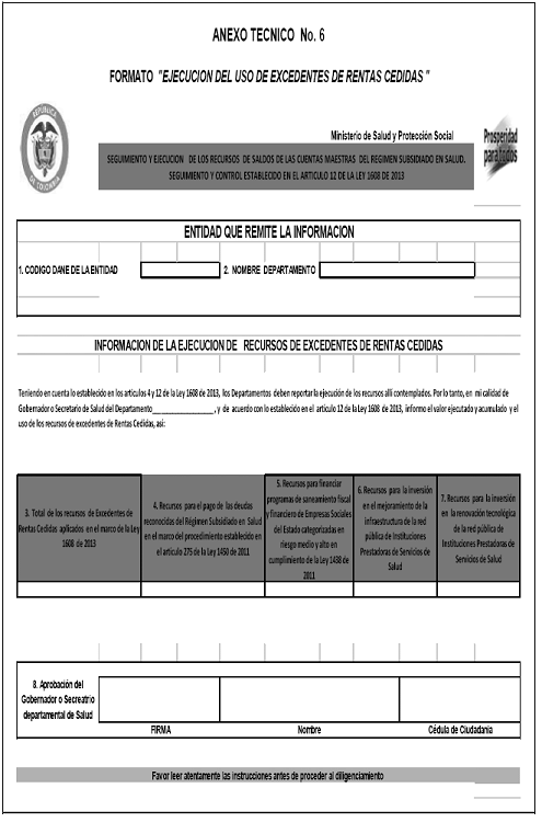 Para el seguimiento y control del uso de los recursos a que hace referencia el artículo 4o de la Ley 1608 de 2013, los departamentos que utilicen excedentes de rentas cedidas deberán diligenciar y enviar en forma obligatoria este formato a la Dirección de Financiamiento Sectorial del Ministerio de Salud y Protección Social, dentro de los diez (10) primeros días hábiles del mes de julio de 2013 y enero de 2014. Los distritos remitirán este formato directamente al Ministerio.
