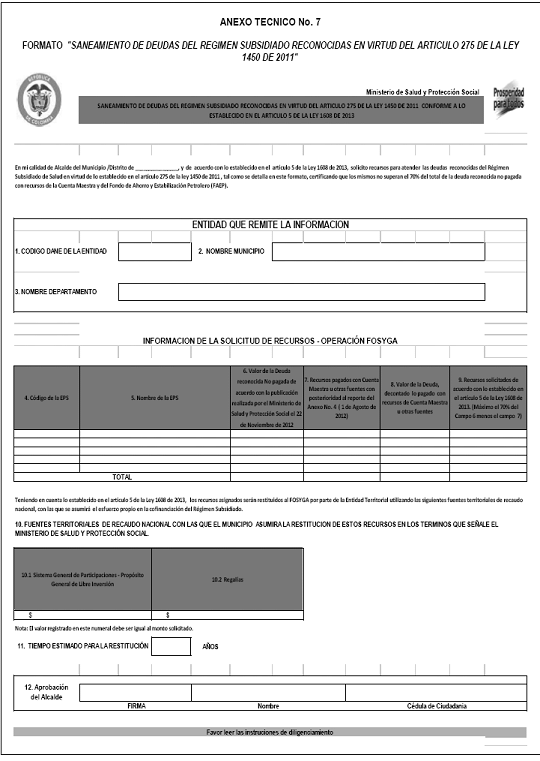 Anexo No. 7. Formato- “Saneamiento de Deudas del Régimen Subsidiado Reconocidas en virtud del artículo 275 de la Ley 1450 de 2011”. Mediante este formato las entidades territoriales, solicitaran los recursos establecidos en el artículo 5o de la Ley 1608 de 2013 y definirán las fuentes territoriales de recaudo nacional con las que asumirán el esfuerzo propio en la cofinanciación del Régimen Subsidiado.