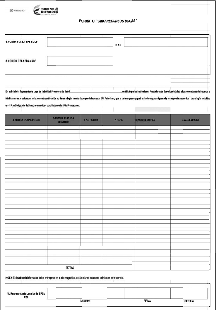 “Artículo 10. Condición para el giro de los recursos. Los recursos provenientes de la suscripción de los Bonos Opcionalmente Convertibles en Acciones (Bocas), serán girados directamente a los Prestadores de Servicios de Salud y Proveedores de Servicios y Tecnologías en Salud incluidos en el Plan Obligatorio de Salud (POS), para lo cual dentro de los cinco (5) días hábiles siguientes a la suscripción del Convenio de Desempeño, la Entidad Promotora de Salud (EPS deberá remitir el Formato “Giro Recursos Bocas”, el cual se adopta mediante la presente resolución, y en el que se certifica que: