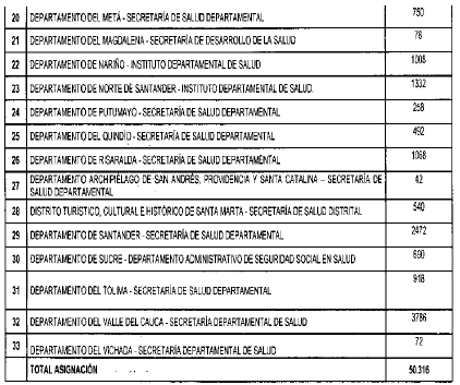 Artículo 2o. Asignación de vacuna para garantizar la segunda dosis al personal que recibió la primera dosis producto de la distribución realizada mediante Resolución número 168 del 16 de febrero de 2021. Asignar 49.134 dosis de la vacuna contra el Covid-19 entregadas por el Fabricante Pfizer Inc y BioNTech el 3 de marzo de 2021, a los departamentos y distritos que se señalan a continuación, las cuales deben ser aplicadas al talento humano que fue beneficiado por las vacunas distribuidas en el marco de la Resolución número 168 de 2021: