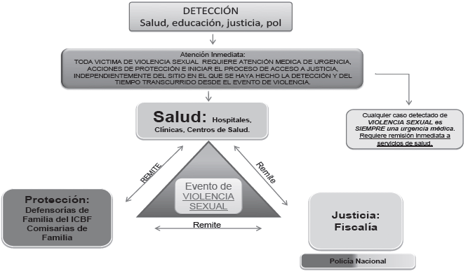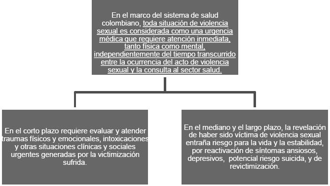 Debido a las implicaciones de la violencia sexual en la salud de las personas y en la salud pública, así como de la relevancia del papel del sector salud en la prevención y detección de la violencia sexual y la atención de las víctimas, se hace necesario contar con herramientas que, de acuerdo con la normatividad colombiana y el funcionamiento del SGSSS, brinden una atención humana y de calidad para garantizar a las víctimas de las violencias sexuales la recuperación de su salud y la restitución de sus derechos a través de una acción articulada entre los sectores de salud, protección y justicia.