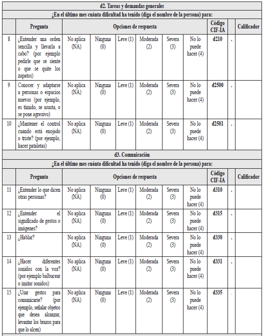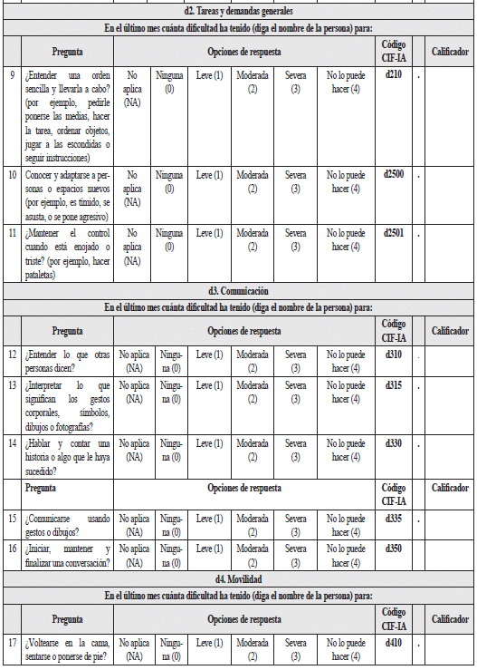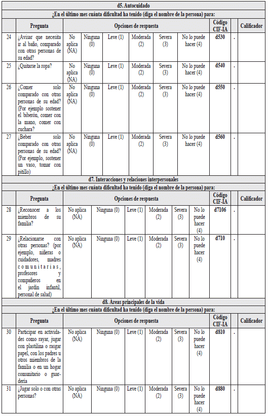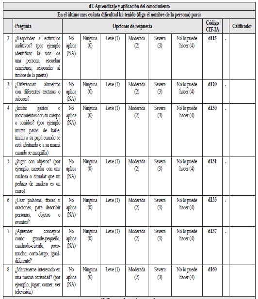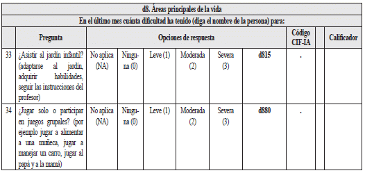 2.1.2.1.2.2 Instrumento para la valoración de limitaciones en las actividades y restricciones en la participación para personas entre tres y cinco años de edad (Tabla 8)