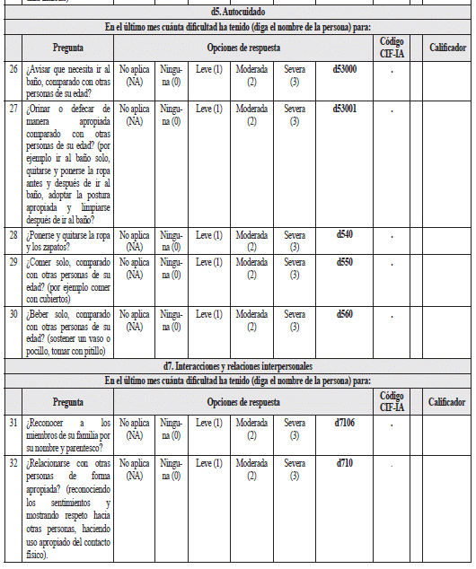 - Las preguntas D1.1 y D3.1 evalúan dos códigos CIF cada una. En este caso se deben registrar los dos códigos evaluados por la pregunta, asignando a cada uno el calificador de la pregunta respectiva. Así, la pregunta D3.1 evalúa los códigos d510. (Lavarse) y d519. (Cuidado de las partes del cuerpo). Si ante la pregunta el entrevistado responde que la persona tiene una dificultad “moderada” para mantener su ropa limpia, tomar un baño o ducha, y cepillarse los dientes sin que se lo pidan, se asignará a la pregunta el calificador 2 en la hoja de respuestas, y se registrarán los códigos CIF d510.2 y d519.2 en el perfil de funcionamiento.