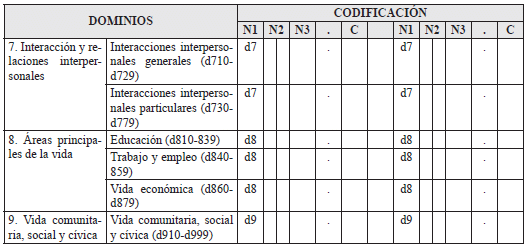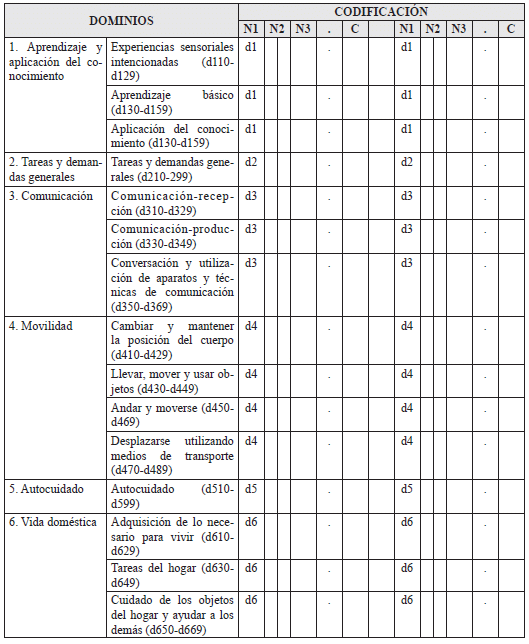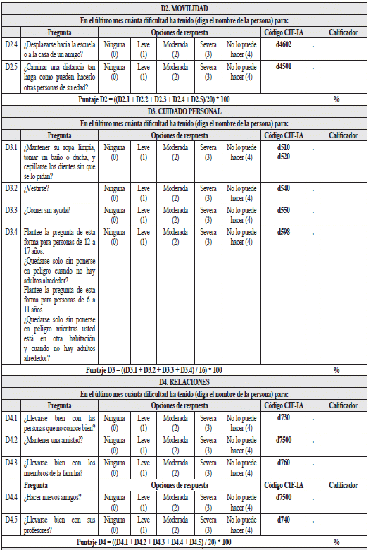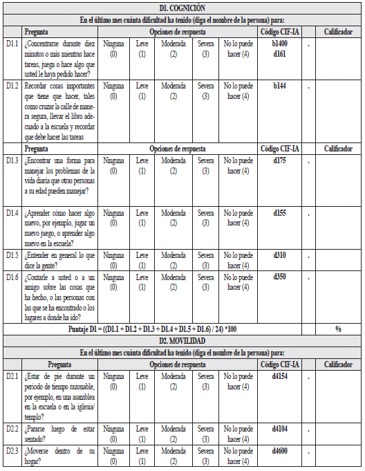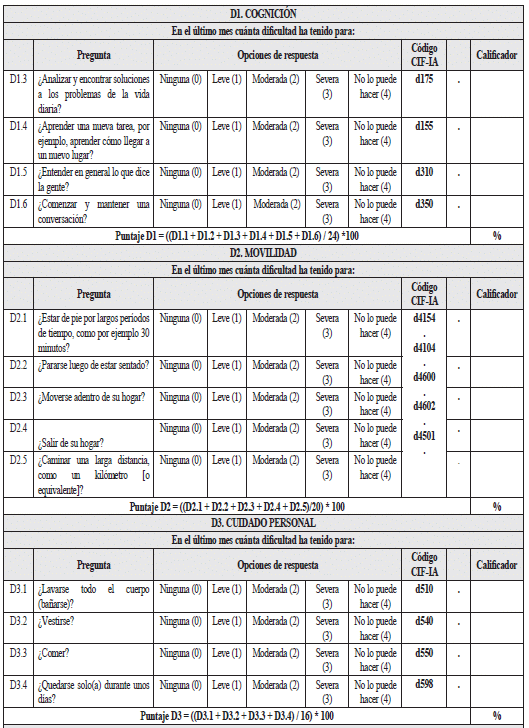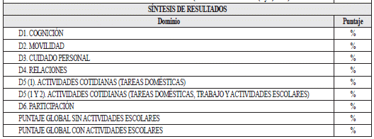 En este apartado se presenta una tabla para escribir el valor de la puntuación de cada dominio y la puntuación global. El propósito de este apartado es compilar los resultados del instrumento en un solo espacio, facilitando el manejo posterior de la información. Estos resultados deben ser registrados en el apartado “nivel de dificultad en el desempeño” del certificado de discapacidad.