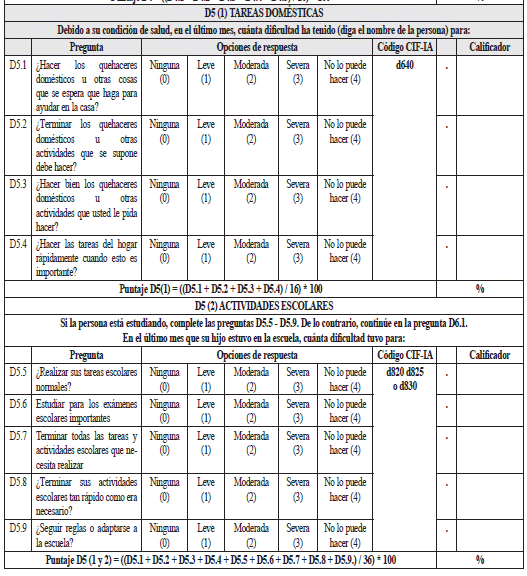 Se debe tener en cuenta que si el solicitante no está trabajando o estudiando, se debe calcular el puntaje de D5 (1), (Tareas domésticas), pero no el de D5 (1 y 2) (Trabajo y actividades escolares). También se debe aplicar la fórmula para calcular el puntaje global sin trabajo y actividades escolares.