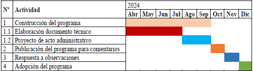 ARTÍCULO 5o. CRONOGRAMA PARA LA ADOPCIÓN DE LA INICIATIVA. La Oficina de Gestión Territorial, Emergencias y Desastres del Ministerio de Salud y Protección Social, en coordinación y colaboración de las demás áreas de este Ministerio y de las entidades con competencia en la materia, elaborará para su adopción el programa que desarrolle la iniciativa "Hospitales Resilientes Frente a Emergencias de Salud y Desastres", en un plazo de nueve (9) meses, conforme al siguiente cronograma: