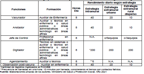 El talento humano para el proceso de agendamiento y aplicación de la vacuna está compuesto por un supervisor, un vacunador, un anotador y un digitador, quienes desempeñarán las siguientes actividades, sin perjuicio de las establecidas en la Resolución 430 de 2021 o la norma que la modifique o sustituya (Ministerio de Salud y Protección Social., 2021):