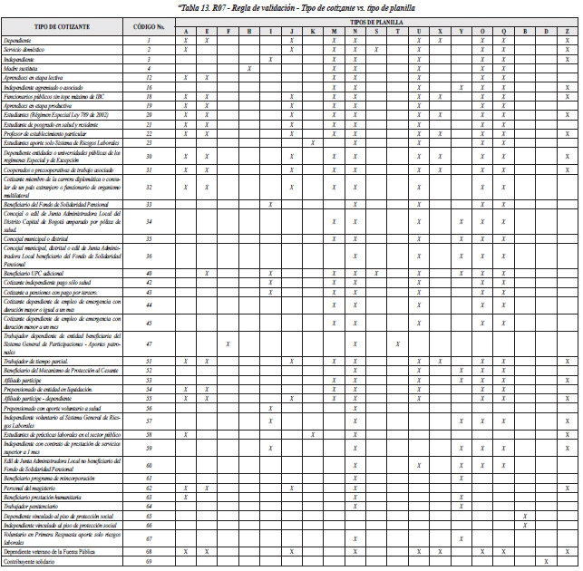 Cuando se marque N o A en el campo “8 - Tipo de Planilla” del registro tipo 1 del archivo tipo 2, para los tipos de cotizantes que se relacionan a continuación el valor del campo “15 - Periodo de pago para los sistemas diferentes al de Salud” del registro tipo 1 del archivo tipo 2 debe ser igual al del campo “16 - Periodo de pago para el sistema de salud” del registro tipo 1 del archivo tipo 2: