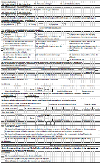 FORMULARIO ÚNICO DE AFILIACIÓN Y REPORTE DE NOVEDADES DE TRABAJADORES, CONTRATISTAS Y ESTUDIANTES AL SISTEMA GENERAL DE RIESGOS LABORALES