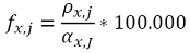 x,j Diferencia entre prevalencias de pacientes con Hemofilia A severa por grupo de edad (j), afiliados a la aseguradora (x); y la prevalencia de pacientes con Hemofilia A severa, para el grupo de edad (j) de todas las aseguradoras (x).