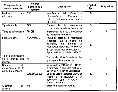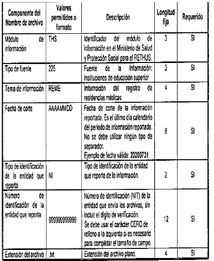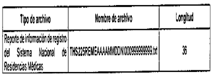 El nombre de los archivos de la información del registro del Sistema Nacional de Residencias Médicas, que debe ser enviado por las instituciones de educación superior con programas de especialización médico-quirúrgicas, debe cumplir con el siguiente estándar: