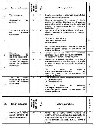 Mediante el Registro Tipo 5, las entidades reportan el detalle de la información de la novedad de cambio de la cuenta bancaria del residente para giro del apoyo de sostenimiento educativo mensual, Estos registros serán rechazados en caso de que no se hayan recibido los soportes documentales de la novedad de cuenta bancaria del residente. Los registros tipo 5 se identifican únicamente mediante los campos 2 y 3 por lo cual estos no deben repetirse.