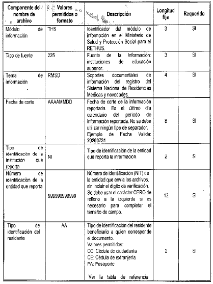 El archivo de la información del Registro del Sistema Nacional de Residencias Médicas está compuesto por un único registro de control (Registro Tipo 1) utilizado para identificar la entidad fuente de la información y varios tipos de registros de detalle numerados a partir del Registro Tipo 2 que contienen la información solicitada, así: