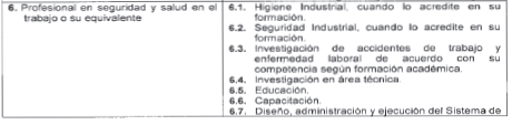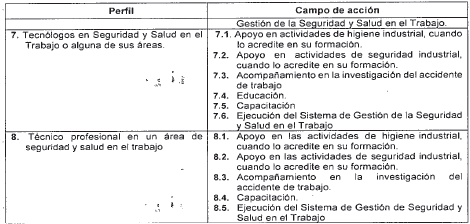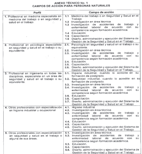 Que, en su Anexo Técnico número 1. “CAMPOS DE ACCIÓN PARA PERSONAS NATURALES” se establecieron campos de acción por nivel y perfil de formación académica en seguridad y salud en el trabajo, definiendo en el perfil de profesional, los siguientes: i) higiene industrial, cuando lo acredite en su formación; ii) seguridad industrial, cuando lo acredite en su formación; iii) investigación de accidentes de trabajo; iv) educación; v) capacitación y; vi) diseño, administración y ejecución del Sistema de Gestión de la Seguridad y Salud en el Trabajo.