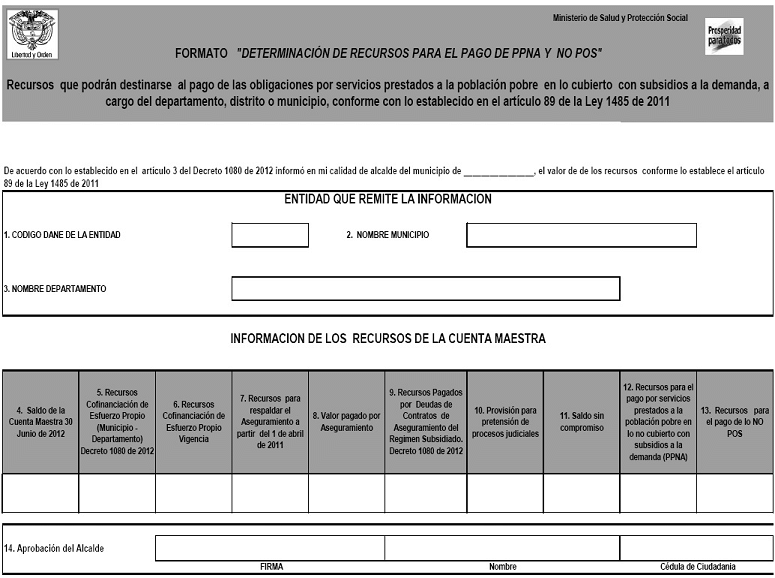 “Anexo número 7. Formato determinación recursos para el pago de obligaciones por servicios prestados a la población afiliada. Formato suscrito por las entidades territoriales del orden municipal o distrital para informar al departamento el monto de los recursos disponibles en las cuentas maestras, para el pago de la obligaciones por servicios prestados a la población pobre en lo no cubierto con subsidios a la demanda, de conformidad con el parágrafo 2o del artículo 3o del Decreto 1080 de 2012, el cual debe ser diligenciado de dentro diez (10) días hábiles siguientes al cumplimiento del plazo establecido en literal a) del artículo 3o del mencionado decreto.”